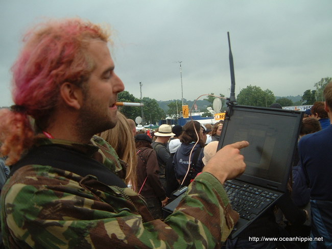 I remember with fondness the great Glastonbury festival of I think 2005, was it really 5 years ago?. We took WiFi kit and wirelessed up large sections of the festival - with limited success, we didn't build the large are network we wanted. None the less when the rain, inevitably, came down, out went all the power, taking out swathes of the infrastructure. PierToPier's long distance links loved it with the interference from the the myriad of other systems off line our long distance links popped up nocely. Thanks to Richards car battery start pack and my £30 inverter. The Glastonbury web tent ran on our WiFi and laptops throughout the rainstorm. The BBC cancelled the "Weather from Glastonbury" ironically because of the weather. My tent flooded and I had to get up to get my laptop out of the water. That morning the news had pictures of wet muddy and bedraggled people, PierToPier.net got those photo's out. While the BBC and ITV cancelled their coverage.