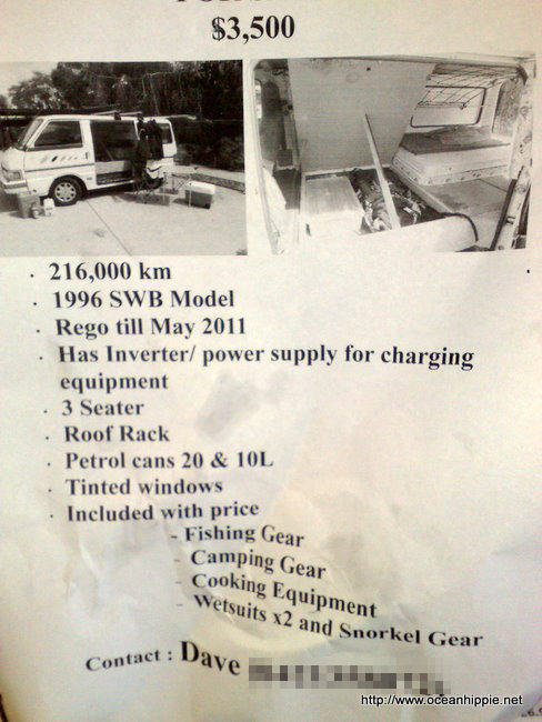 I'm in the YHA in Darwin, for a couple more nights. I am the proud owner of a Toyota Tarago Van. The Tarago id a Previa in the rest of the world. The old ones were vans made into (in mines case) people cariers. The later version were people carriers from scratch.