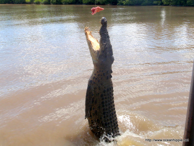 But not satisfied with one-sided existence, Territorians have now taught crocodiles to actively seek out humans as a source of regular food. Thanks to the "jumping crocs" phenomenon, these giant killing machines have been trained to think that if they are hungry they just have to listen for the sound of a small tinnie crammed with people, swim up right beside it, leap out of the water with their jaws wide open as close to the humans as possible.