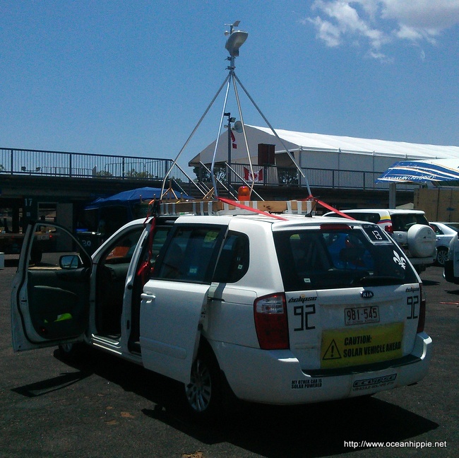 What raised my attention was 2 years ago, swimming in Berry Springs, I ran into some guy's invovled with the last race. Their hire car was modified, more "geek my ride" than "pinp my ride." Wood cables, guy ropes screens and a weather station strapped to the roof with ratchet straps through the doors.
