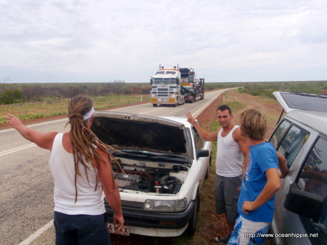 Some times you don't get a Knight, just a geek in a shining 20 year old Toyota. We pulled over about 20kms south of nowhere. If nowhere is a place then the Desert Hotel in Renner Springs* is it, its 140 km from the "arse end of the world" Tenant Creek. So 120km's from the nearest Garage, we came across a you French Couple in a 20 year old banger broken down by the road side.