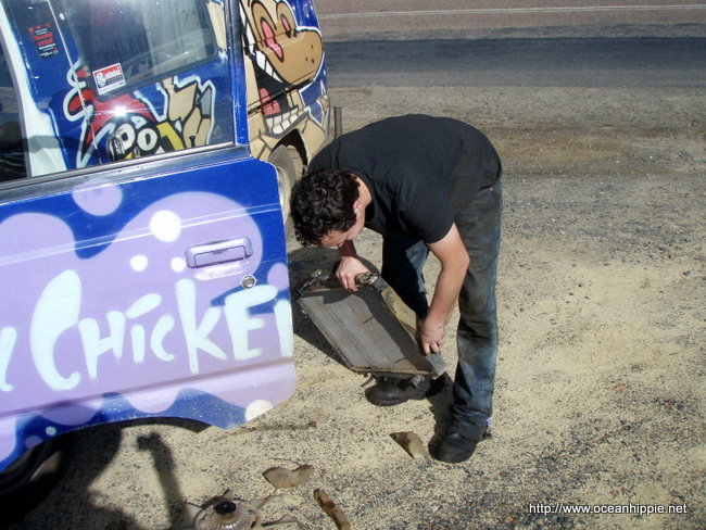 Hit a roo, or god forbid a cow. Does happen, a guy from JJ's in Darwin, bought a van and spent a lot of time and effort, and money, on it, then hit a cow in mid nowhere WA, ended up taping "Free Stuff" to the side of the van and leaving it in the outback. Bummer. Driving at night and its pretty much a matter of time before you hit a roo, a little one won't hurt. But a big one at speed and the whole front and windscreen is gone.