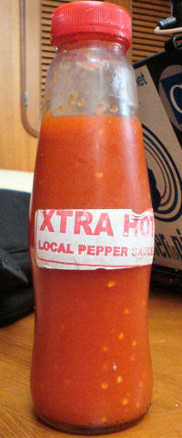 Our first arrival in St Lucia on Ramprasad was on a Sunday, the only open place being the petrol station, where we obtained a bottle marked "Local Pepper", written in permanent marker on a gummed on label. Re used bottle of course. It was lethal. Simon fried some of it with plantain. The results can only be described as mustard gas. It led to the evacuation of the boat