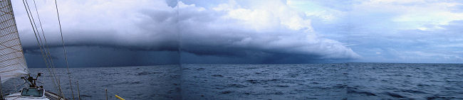 Well this is seriously getting to be character building. As is I'm actually having to sail. I've reefed in and out about 8 times so far today. The good news is, we're moving, generally (though this varies wildly) towards the Galapagos. We've only used the engine for about an hour since I set sail shortly after dawn. However its raining cats, dogs chickens, hamsters and possibly badgers. Eugh. The photo is a stitched together panorama of the cloud this morning, looks less menacing in this pic. Normally my panorama image join prog is pretty good, struggled with this one. The black dot just above the hatch is the boobie, it stayed for the night.
