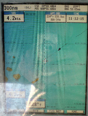 You can tell we're in the Pacific islands proper now. The chart says we're anchored on land. Coming in last night was interesting, fortunately we had the Radar. Which told us that the shore that looked closer than it should be was closer than it should be.