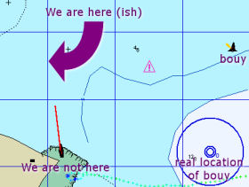 We are now about a mile from where we stopped last night. The log (the sensor that tells you half fast your going through the water). Reads 1 knot ish (not that its gonna be terribly accurate at that point, but that's still sweet Fanny Adams). But were doing 2.2 knots in the direction we want to go.