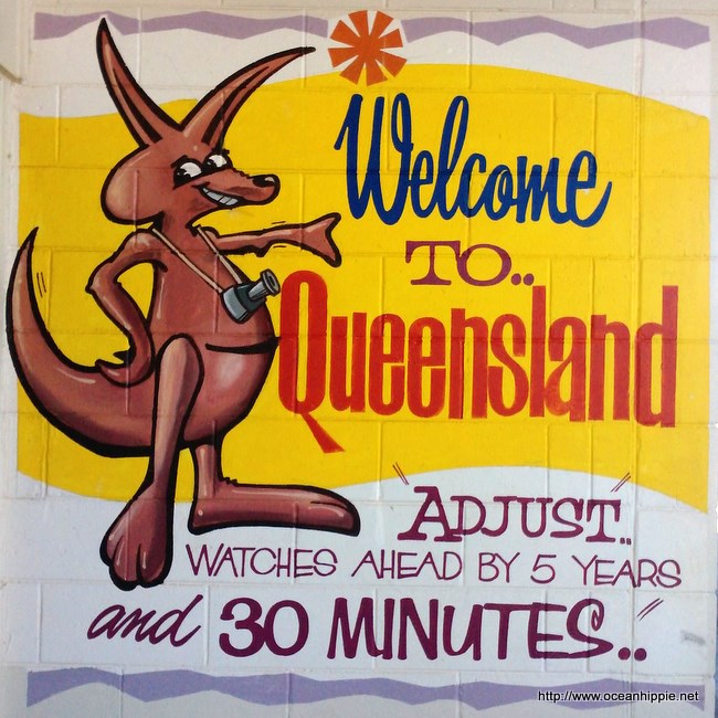 The sign on the wall of the road house in the last fuel station before the Qeensland border tells you to set your clock forward 5 years and the 1/2 hour for the time zone change between Queensland an the Northern Territories.
