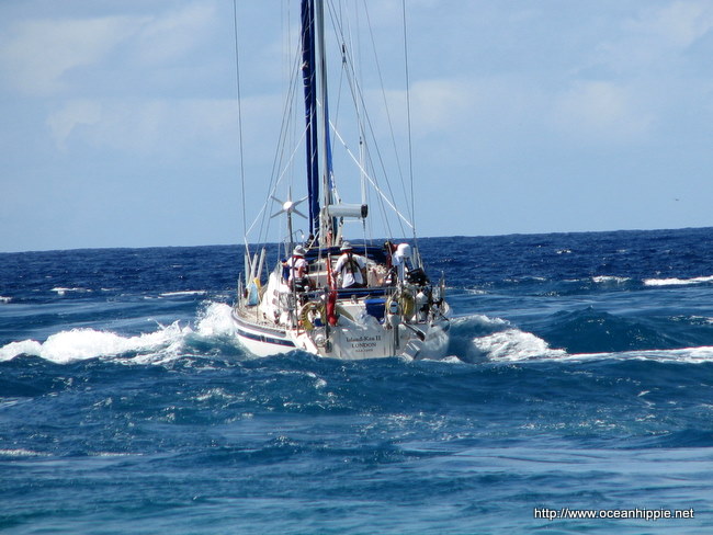 We got alot done in Tahiti, and I fixed tweaked or played with a lot of peoples IT problems. Also swaped some photos. Steve and Maria off "Aspen" decided to photograph us leaving the pass at Tiputu in Rangiroa. Partly for us and partly I suspect to see what happened. The large southerly swell was throwing waves over the reefs and motus on the southern side. Acting as a pump to fill the Lagoon up. It meant the pass never stopped ebbing. We punched into it and we flew out like a cork from a bottle. They shot video as well and its fab! Not even going to try and uploaded it right now, even if I could get on line.
