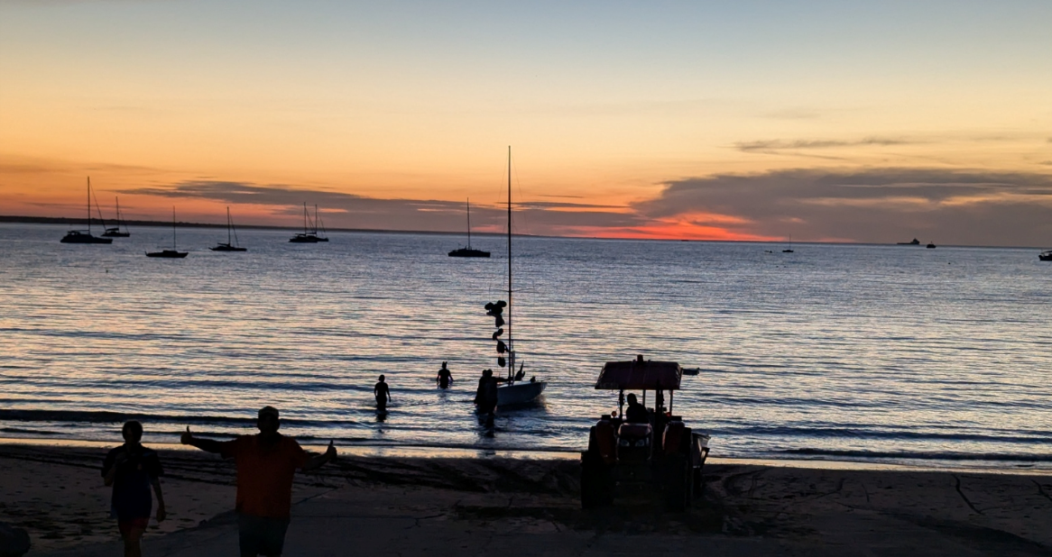 With an outgoing tide, and relatively fluky wind it was a minefield off Larrakia, full disclosure, Shaw Thing went too far into Doctors Gully taking when the keel found mud. But it still paid. We were able to catch Joust by Stokes hill Wharf. Unfortunately Zanzibar near caught us at the same time.