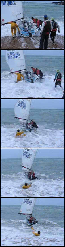 LAUNCHING. Bit of a lost art in Brighton this one, we’re also a bit anti social in this too. Most clubs launching in surf have organized gangs to get people on and off the beach the mono’s in the club are fairy supportive of each other in this. The technique is this. Get your boat set up, fully, no “I’ll sort it on the way to the start line” stuff please. Get your boat off its trolley, or gutters, right on the very edge of the water. If you have a mono, make sure it is canted over to Leeward a bit to keep the gravel out of the dagger board slot. Point its nose the course you intend to sail. Sheet the jib in (if you've got one), get the rudder ready on ready to go down, slot the board in, tidy up ropes so you don’t get tangled, make sure the main sheet runs freely, flip your tiller extension out the windward side. Stand with the Helm on the windward back corner, the crew at the windward shroud (or “assistant” if you’re a single hander), with his ankles getting wet. Both of you holding the boat at its angle, heeled and preventing it from sailing off. You’re now ready. Don’t launch, not yet, watch the waves, they come in a pattern of about 1 big wave followed by 6 or 7 small ones. This is due to the relative wave lengths of Channel and Atlantic waves, so its not an exact science. Take a few minutes In the ready position mentioned above. Use this time to familiarize your crew with what your going to do. Wait for a big wave, estimate the flat patch behind it, if it looks good go for it. Push the boat fast into the water, jump in and sail off before the next wave hits. The crew needs a little dagger board asap, but don’t ground it. Just enough to steer. Be gentle with the main sheet, too much and you’ll go head wind and reverse pitch pole or snap your rudder(s) by coming up the beach backwards. Don’t worry too much about your dignity, the important thing it to get the 10 ft or so past the breakers, your safe there. Once out, get out to sea, land is the enemy in this weather and get your rudders etc down at your leisure, being careful not to power up the boat. By either, bearing off too much, or sheeting in too hard. Remember a heeled over mono hull heads up into wind, that’s a nightmare, so keep it flat.